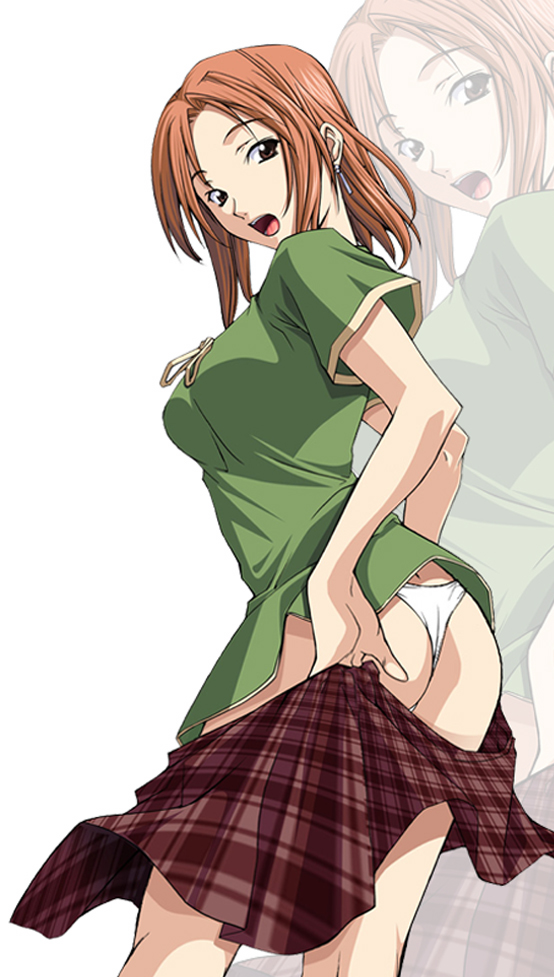 hinase saharu, suzumiya haruhi, suzumiya haruhi no yuuutsu, 00s, 1girl, blush, brown hair, female focus, green panties, hairband, miniskirt, panties, pantyshot, school uniform, serafuku, short hair, skirt, solo, standing, striped clothes, striped panties, underwear