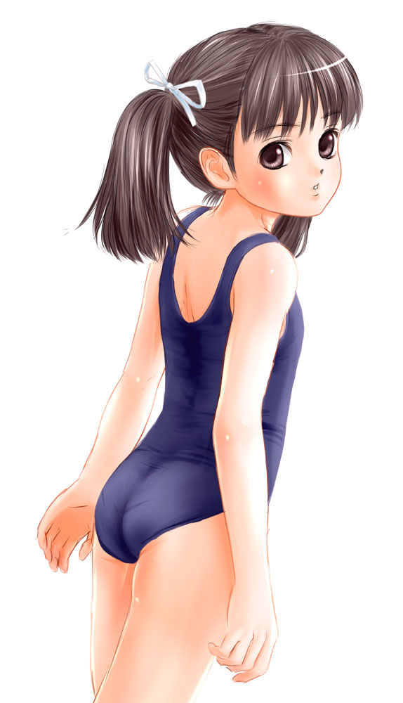 1girlassbrown eyesbrown hairchildfemale focusfrom behindlooking backone-piece swimsuitschool swimsuitshort hairsoloswimsuittwintails