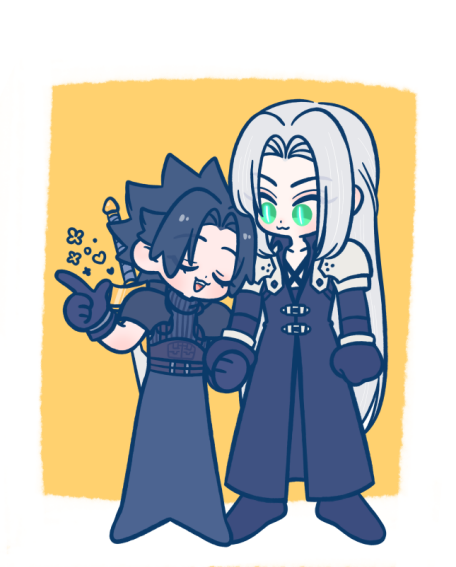 :32boysarmorbeltblack bootsblack coatblack glovesblack hairblack pantsbootsborderbrown beltchest strapchibichibi onlyclosed eyescoatfull bodyglovesgreen eyesgrey hairholding handslong coatlong hairlooking at anothermale focusmultiple beltsmultiple boysopen mouthpantsparted bangspauldronspointingshort hairshoulder armorslit pupilssmilestandingswordsword on backweaponweapon on backwhite borderyaoiyellow background