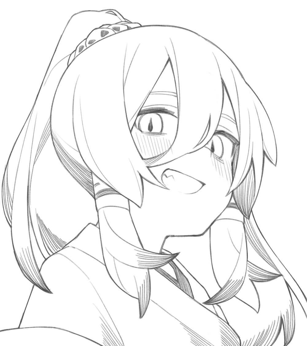 1girlblushgreyscalegrinhair tubesjapanese clotheskosodelooking at viewermikomonochromeponytailsmilesolo