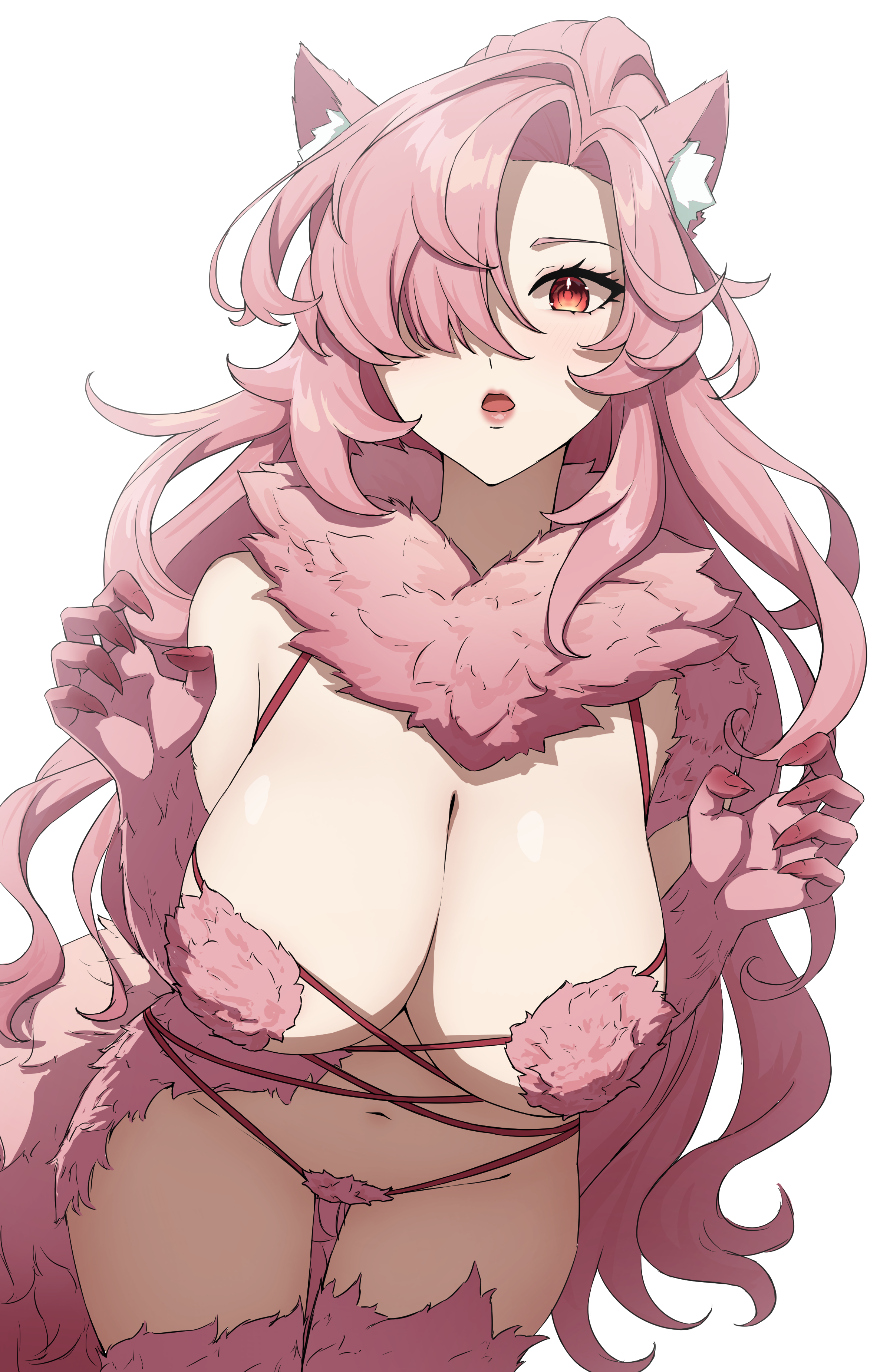 1girlanimal earsblushbreastscleavagecosplayfur bikinifur collarfur trimfur-trimmed legwearfur-trimmed thighhighshair over one eyehalloween costumelarge breastslong hairlooking at viewermash kyrielight (dangerous beast) (cosplay)navelopen mouthpink hairpink thighhighsred eyesrevealing clothessimple backgroundsolotailthighhighsvery long hairwhite backgroundwolf earswolf tail