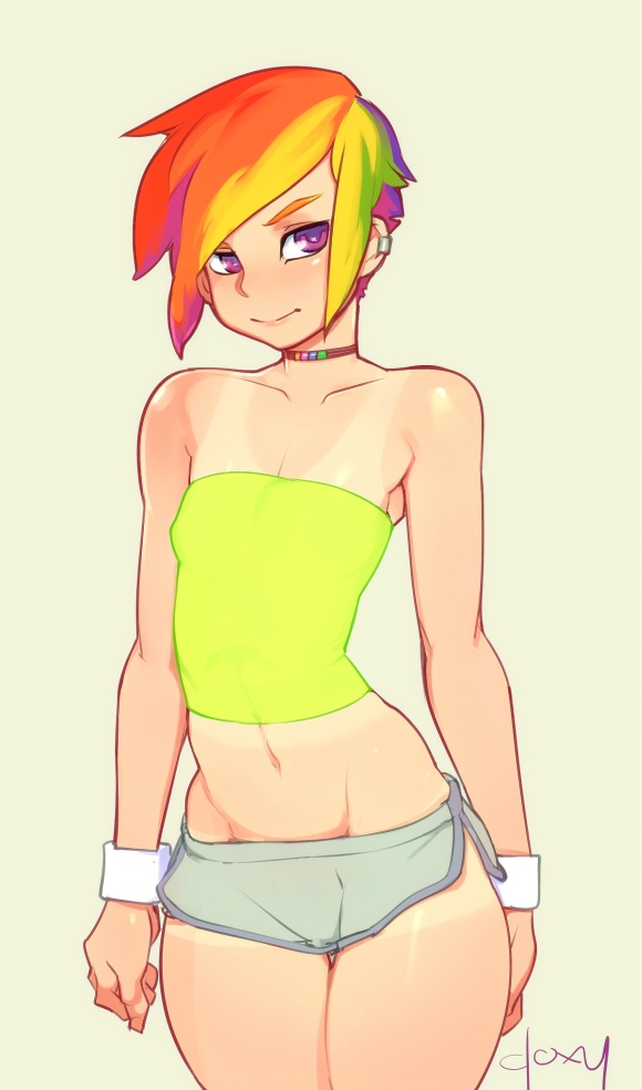 chokerfemaleFlag for Deletionflat chestmidriffmound of venusnavelpersonificationpurple eyesrainbow hairshort hairshort shortsshortssmilesolotantanlinethighstubetopwrist cuffs