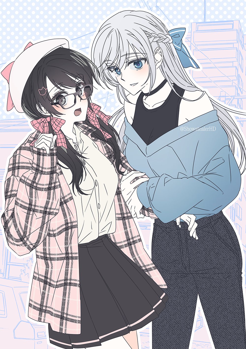 2girlsblack eyesblack hairblack pantsblack skirtblack tank topblack-framed eyewearblue backgroundblue eyesblue sweaterblushbowbraidbreastscat hair ornamentcowboy shotdress shirtflannelglassesgrabbing another's armgrey hairhair bowhair ornamenthalf up braidhand uphands on another's armhatlong hairlong sleeveslooking at anotherlooking at viewerlow twintailsmedium breastsmultiple girlsoff shoulderoff-shoulder sweateropen mouthpantsparted lipspink bowplaid bowpleated skirtpolka dotpolka dot backgroundshirtshirt tucked inshowstealerhdsidelocksskirtsmilesweatertank toptwintailswhite hatwhite shirt