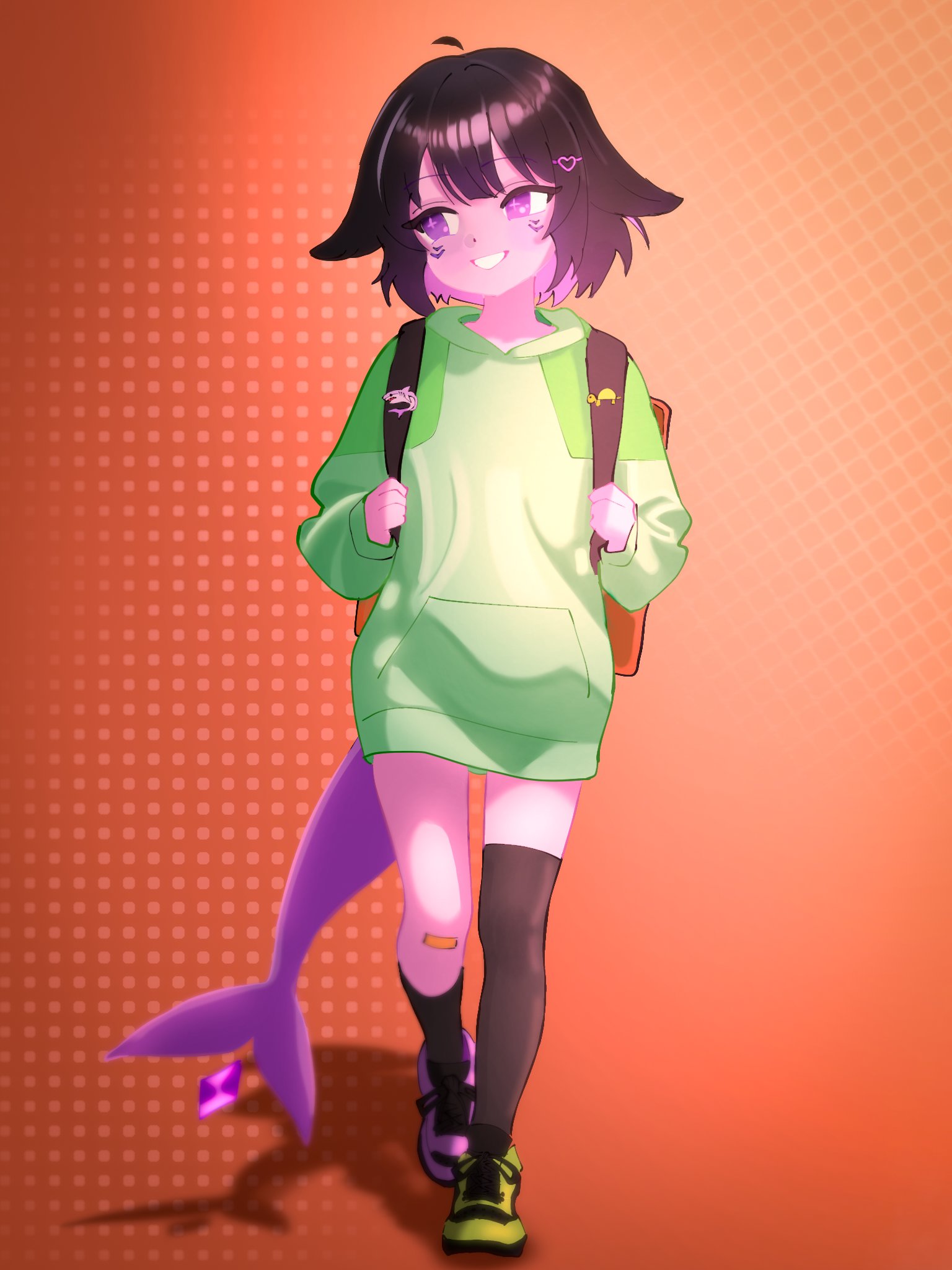 1girlahogebackpackbagbandaidbandaid on kneebandaid on legblack socksbrown bagcolored skindetached ahogeeyelashesfinsfish tailfull bodygreen hoodiehair ornamenthairclipheartheart hair ornamentholding straphoodhood downhoodieif they matedlong sleevesmanuh985mismatched shoespink shoespink skinpurple eyespurple hairshadowshark girlshark tailshoesshort hairsmilesockssolostandingtailvedal aivirtual youtuberyellow shoes