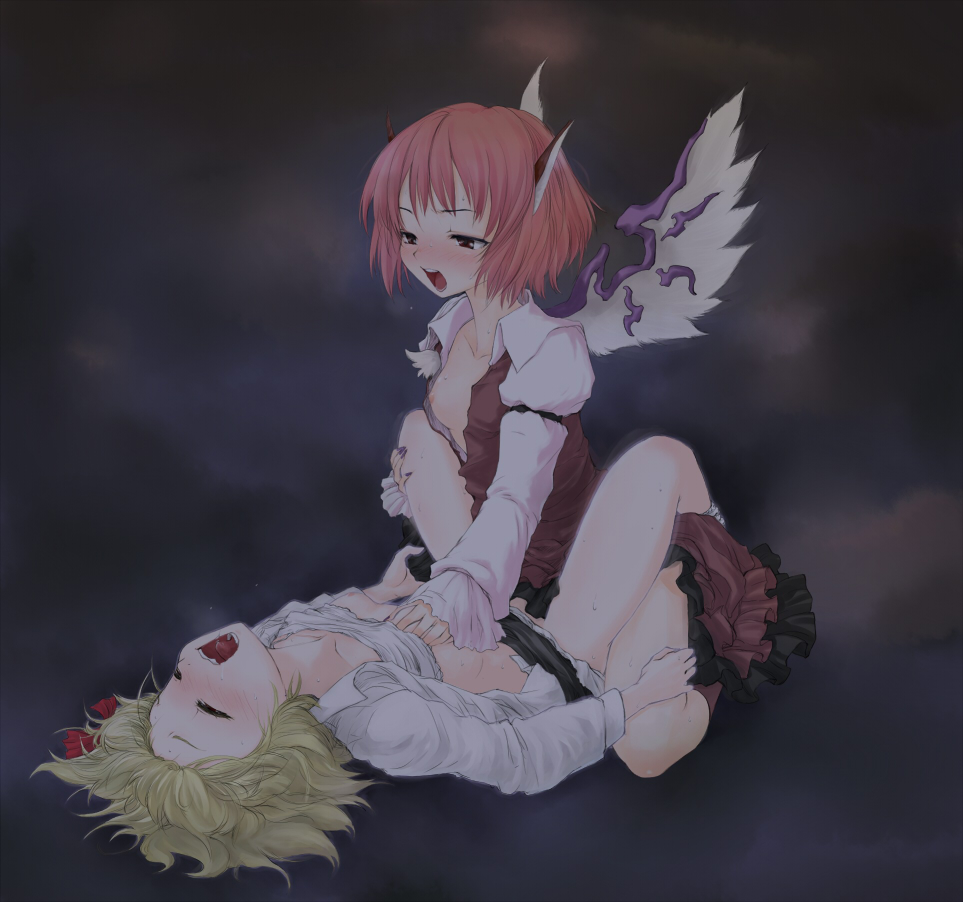 2girlsblonde hairblushbreastsclosed eyesfemale focusgrabbing another's breastgropinglolimultiple girlsnipplesopen clothesopen mouthopen shirtsalivashirtsmall breastssweattonguetribadismwingsyuri