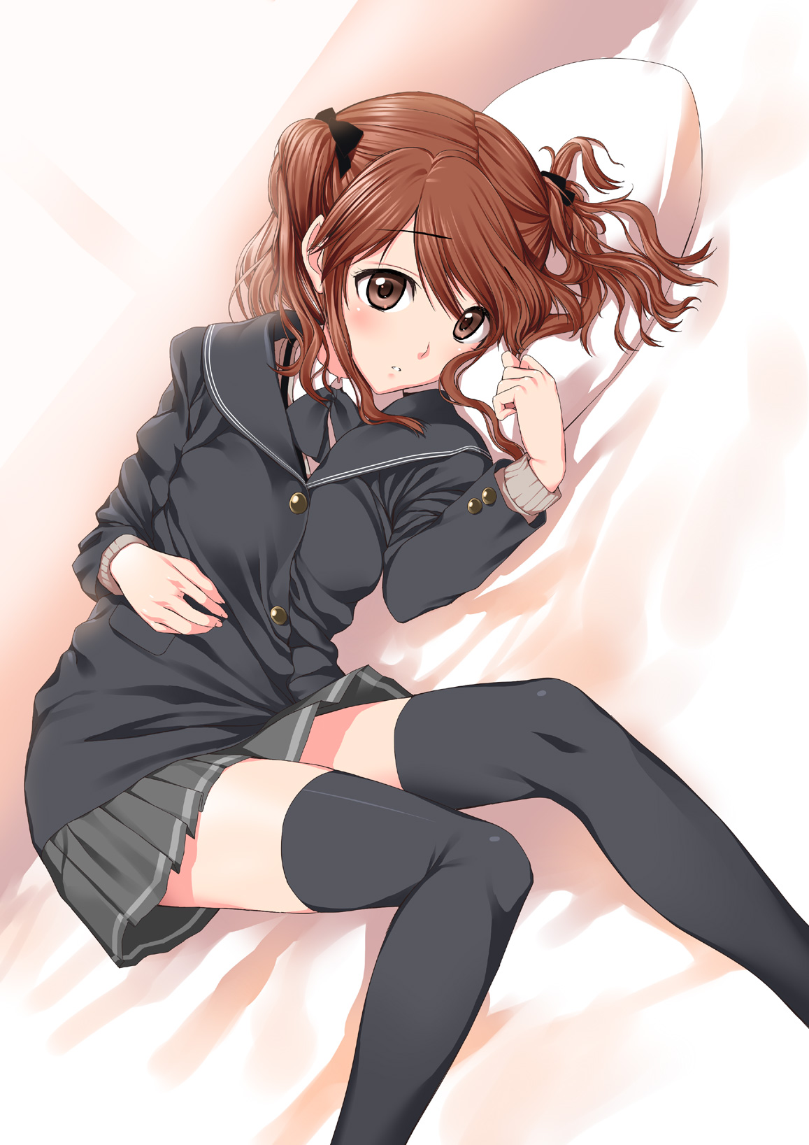 1girlbedbrown eyesbrown hairfemale focuslyingpillowschool uniformserafukushort hairsolothighhighstwintails
