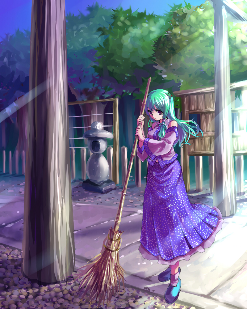 1girlbamboo broombroomfemale focusgreen hairlight rayslong skirtoutdoorsskirtsolostone lanternsunbeamsunlightsweepingtorii