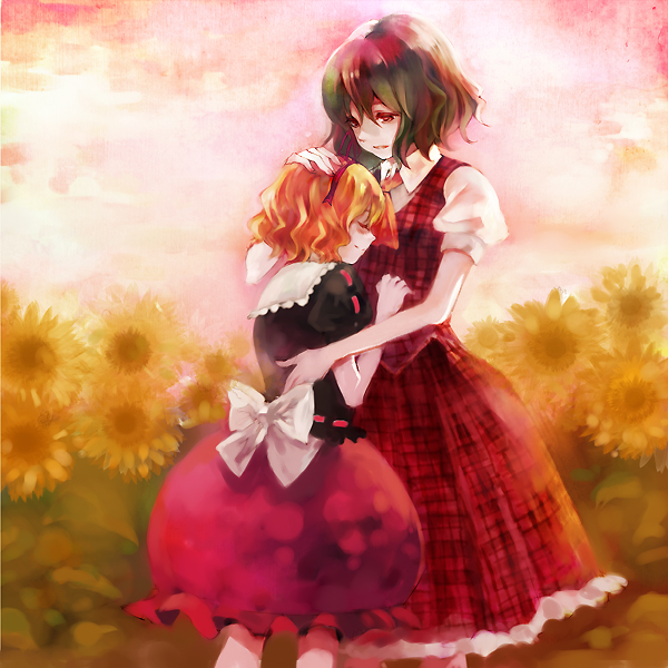 2girlsascotblonde hairbubble skirtclosed eyesfemale focusflowergreen hairhand on another's headhugmultiple girlspettingplaid clothesplaid skirtplaid vestred eyesshort hairskirtskirt setsunflowervest