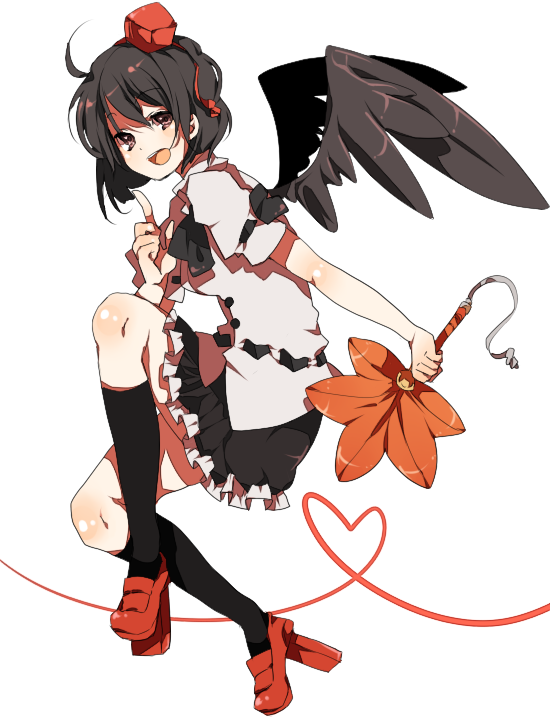 1girlblack hairblack socksblack wingsfemale focusgetahand fanhatkneehighslooking at vieweropen mouthshoesshort hairsockssolostringstring of fatetengutengu-getatokin hatwings