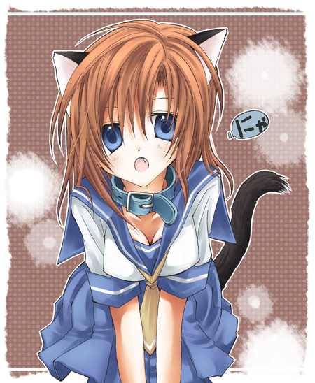 00s1girlanimal earsblue eyesbreastsbrown haircat earscat tailcleavagecollarfangfemale focuskemonomimi modeorange hairschool uniformserafukushort hairsolotail