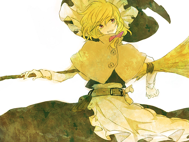 1girlblonde hairbowbraidbroomfemale focushatshort hairsimple backgroundskirtsolowhite backgroundwitchwitch hatyellow eyes