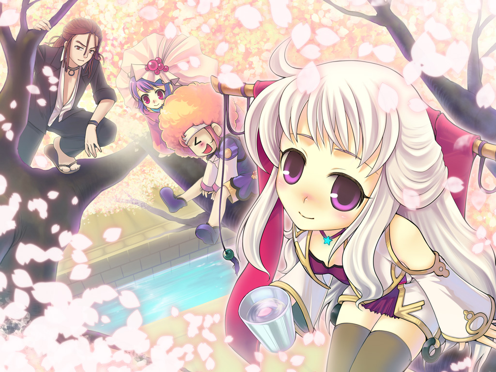2boys2girlsafroalcoholblazerblonde hairblushcherry blossomsheadbandjacketjewelrylong hairmultiple boysmultiple girlsnecklacenose blushopen clothesopen jacketopen mouthopen shirtpetalspurple eyespurple hairred eyesred hairsakesandalsshirtshort hairsideways mouthsittingsmilestar (symbol)star necklacethighhighstreewaterwristband