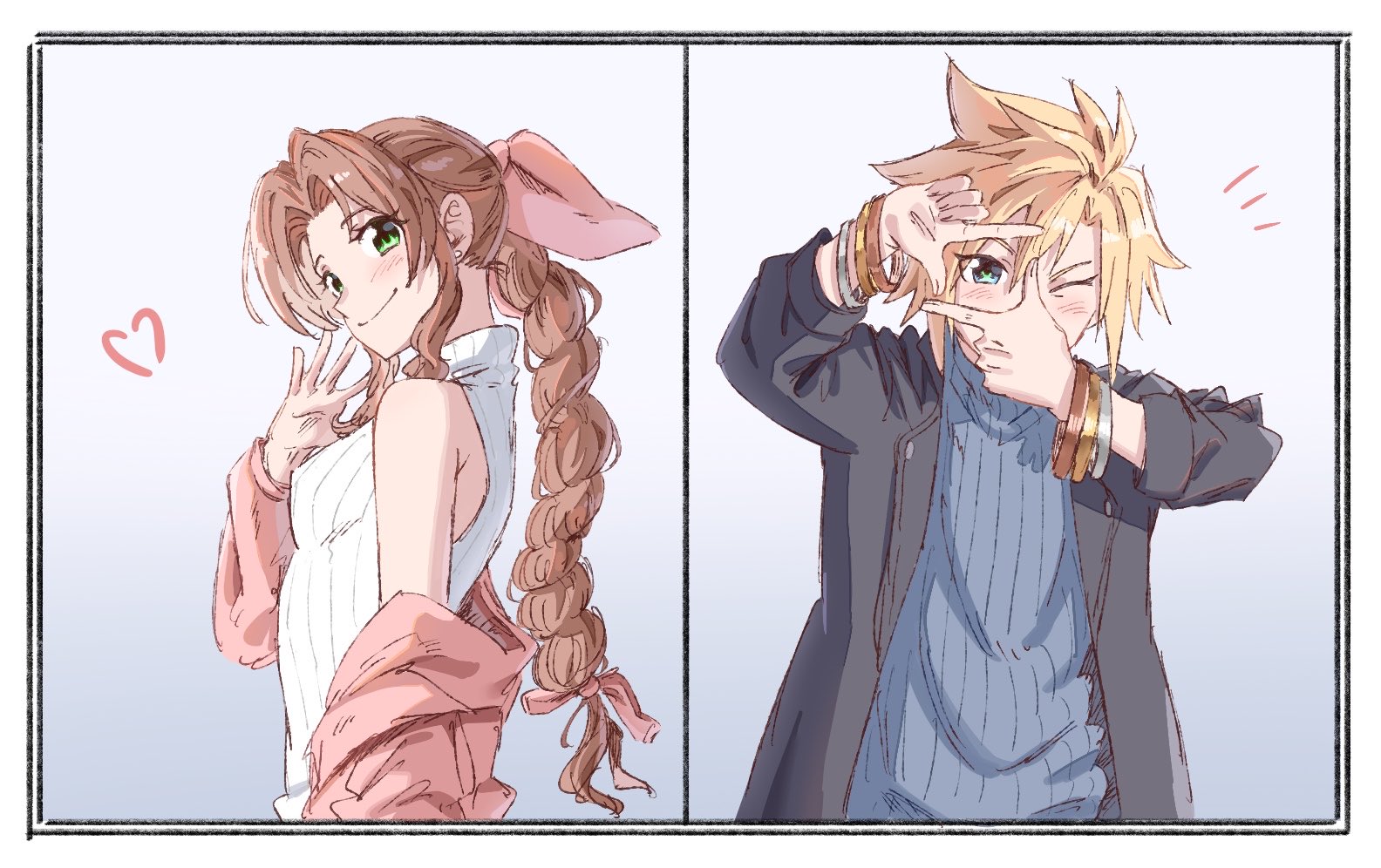 1boy1girlbanglebare shouldersblack jacketblonde hairblue eyesblue shirtborderbraceletbraidbraided ponytailbreastsbrown hairdressearringsgradient backgroundgreen eyeshair between eyeshair ribbonjacketjacket partially removedjewelrylight blushlong hairlooking at anothermedium breastsone eye closedparted bangspink jacketpink ribbonribbonshared clothesshirtshort hairsidelockssingle braidsingle earringsleevelesssleeveless turtlenecksmilespiked hairturtleneckturtleneck dressupper bodywavingwhite borderwhite dress