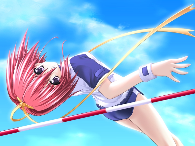 1girlarched backburumaeyes visible through hairfemale focusgym uniformhigh jumplooking at vieweroutdoorspolepurple eyesred hairshiny skinshort hairsolotrack and field