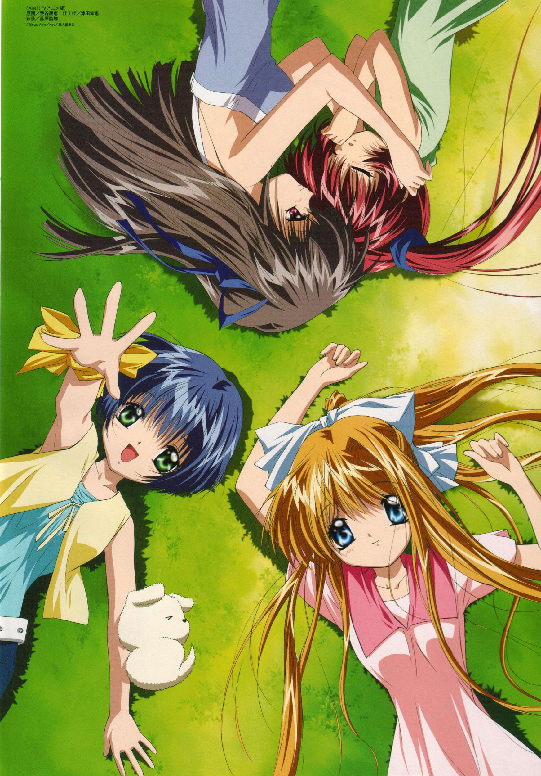 aaru sentou shuudan, rakka (haibane renmei), haibane renmei, 00s, 1girl, copyright name, day, female focus, halo, neckerchief, outdoors, red neckerchief, sitting, solo, static cling, traditional halo, water, wings