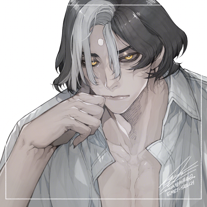 1boyblack haircharacter nameclosed mouthcollarbonecollared shirtdatedfacial markforehead markhair between eyeshand on own cheekhand on own facelooking at viewermale focusmulticolored hairopen clothesopen shirtpectoralsshirtsignaturesolotwo-tone hairupper bodywhite backgroundwhite hairwhite shirtyellow eyes