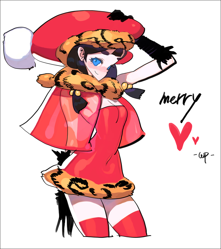 1girlblack glovesblue hairchristmasdressfemale focusglovessanta costumesanta dresssolothighhighs