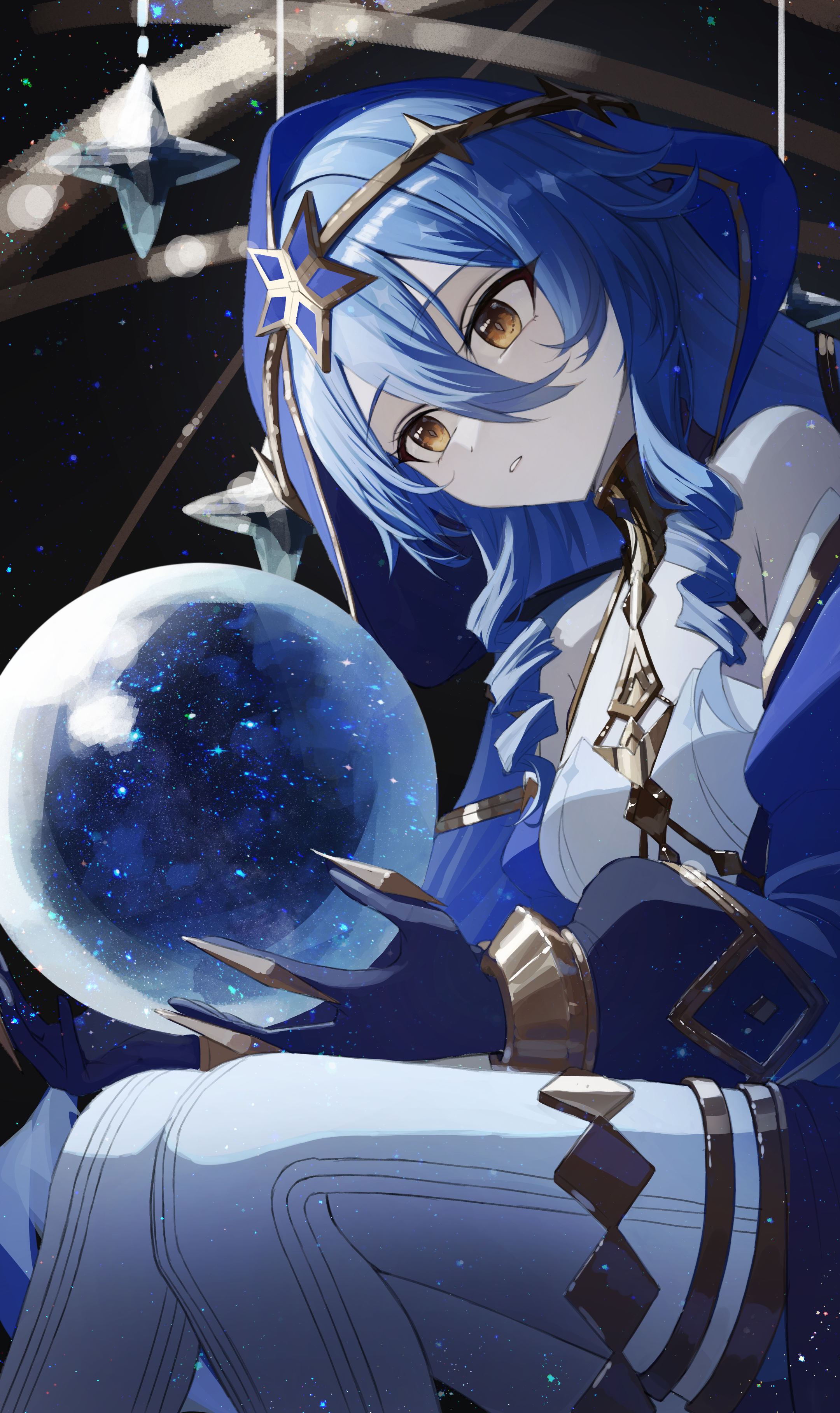 choco la tea, furude rika, raising heart, raising heart (exceed mode), tamura yukari, higurashi no naku koro ni, lyrical nanoha, mahou shoujo lyrical nanoha, spoilers, translated, 00s, 1girl, blue hair, borrowed weapon, bow, cool your head, crossover, female focus, long hair, mary janes, nipa~, no eyes, purple eyes, school uniform, serafuku, shirt, shoes, skirt, socks, solo, suspender skirt, suspenders, voice actor connection