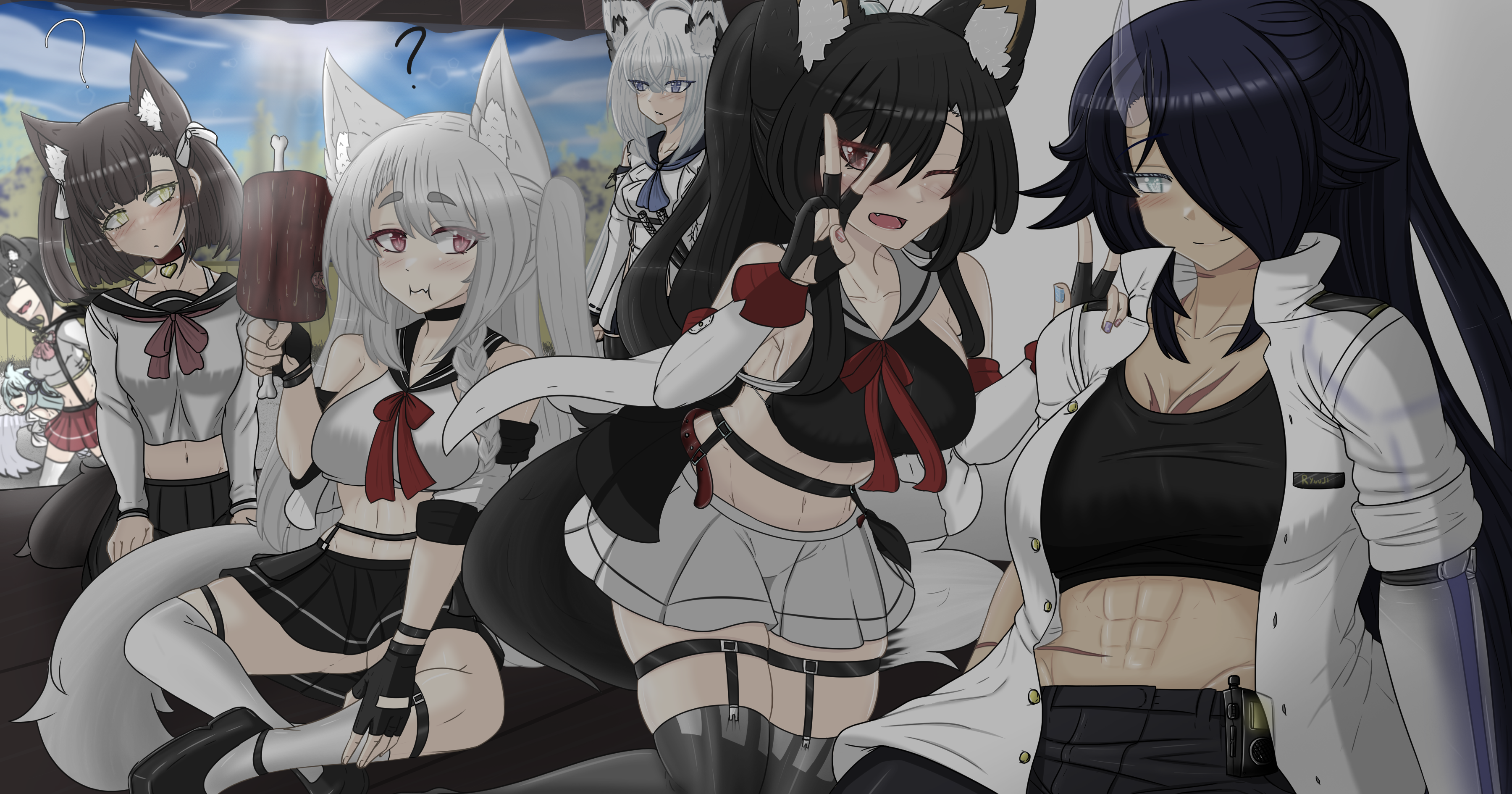 :d1boy6+girlsanimal ear fluffanimal earsbare shouldersblack glovesblack hairblack sailor collarblack skirtblack thighhighsblue hairblue skybonebreastseatingeyes visible through hairfingerless glovesglovesgrey hairhair between eyesholdingholding bonehornsjacketkneehighslarge breastslong hairmedium breastsmedium hairmidriffminiskirtmultiple girlsopen clothesopen jacketopen mouthpleated skirtponytailred eyesred ribbonred skirtribbonsailor collarscarsee-through hornsshirtskirtskysmilesocksthigh strapthighhighsvwhite eyeswhite shirtwhite skirtwhite socksxdyellow eyesyuukirimiya
