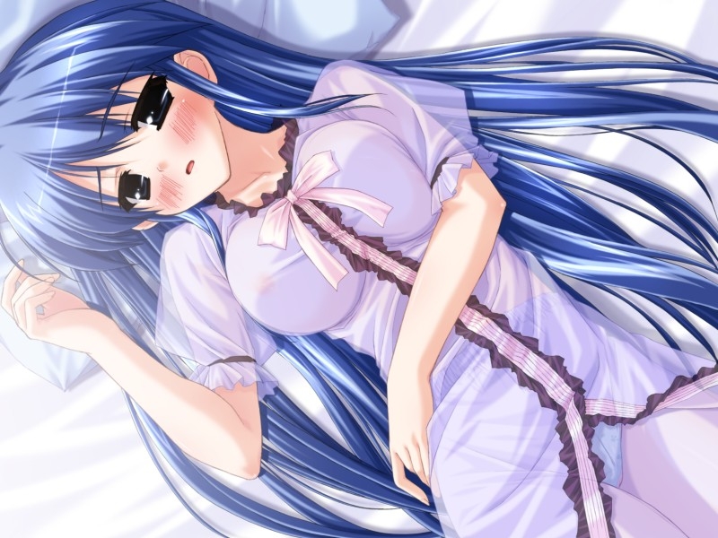 1girlbedblue hairblushdutch anglefemale focuslong hairpajamaspantiessee-through clothessolounderwear