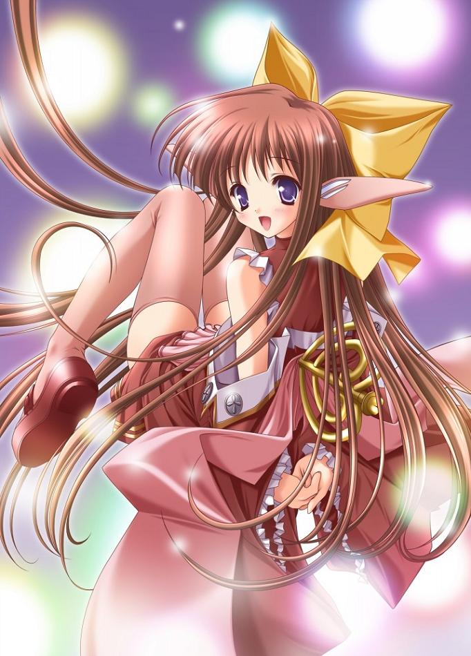 1girlarms behind backbrown hairdetached sleevesfemale focusfrillshair ribbonlong hairlooking backown hands claspedown hands togetherpink thighhighspurple eyesribbonrobot earssolothighhighsvery long hairzettai ryouiki