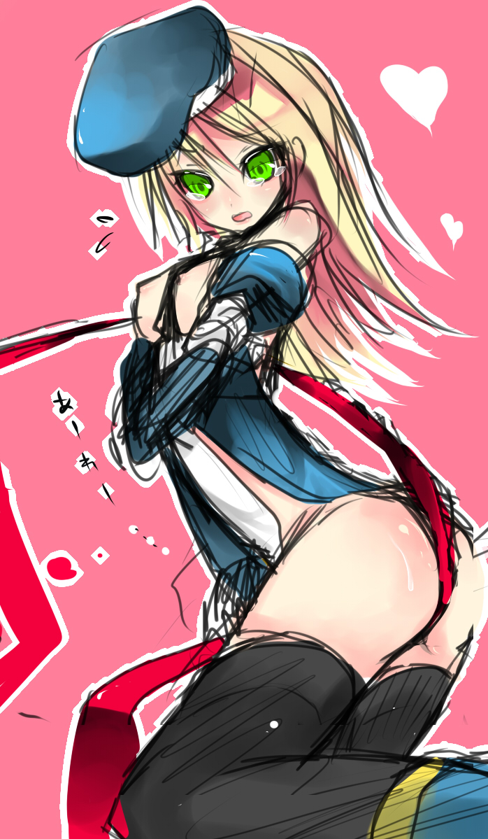 1girlblonde hairbreastsdetached sleevesdressfemale focusglovesgreen eyesgunhatmedium breastsnipplesshort dresssketchsolothighhighsweapon