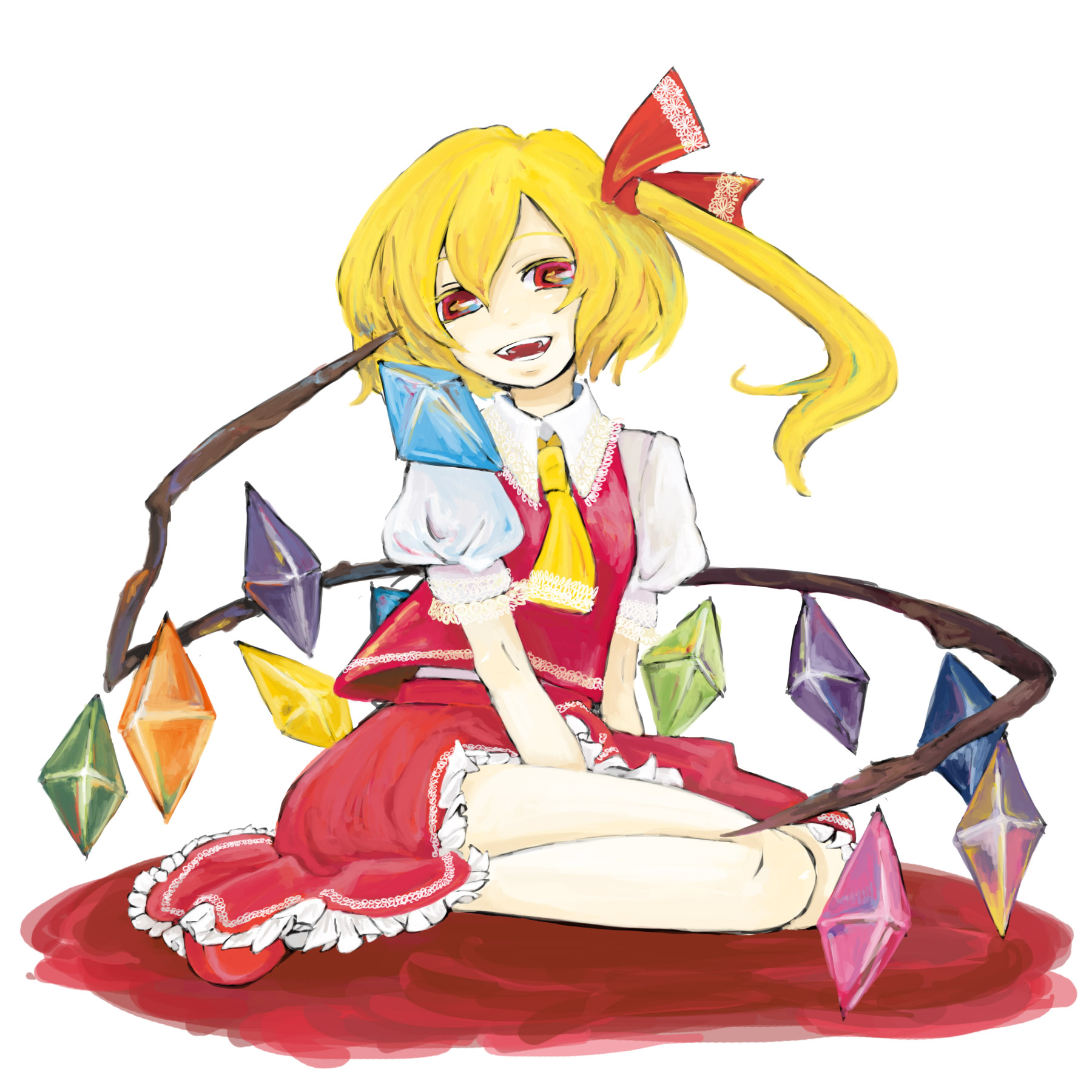 1girlblonde hairbloodfangsfemale focusfull bodykneelingred eyesshort hairsolowhite backgroundwings