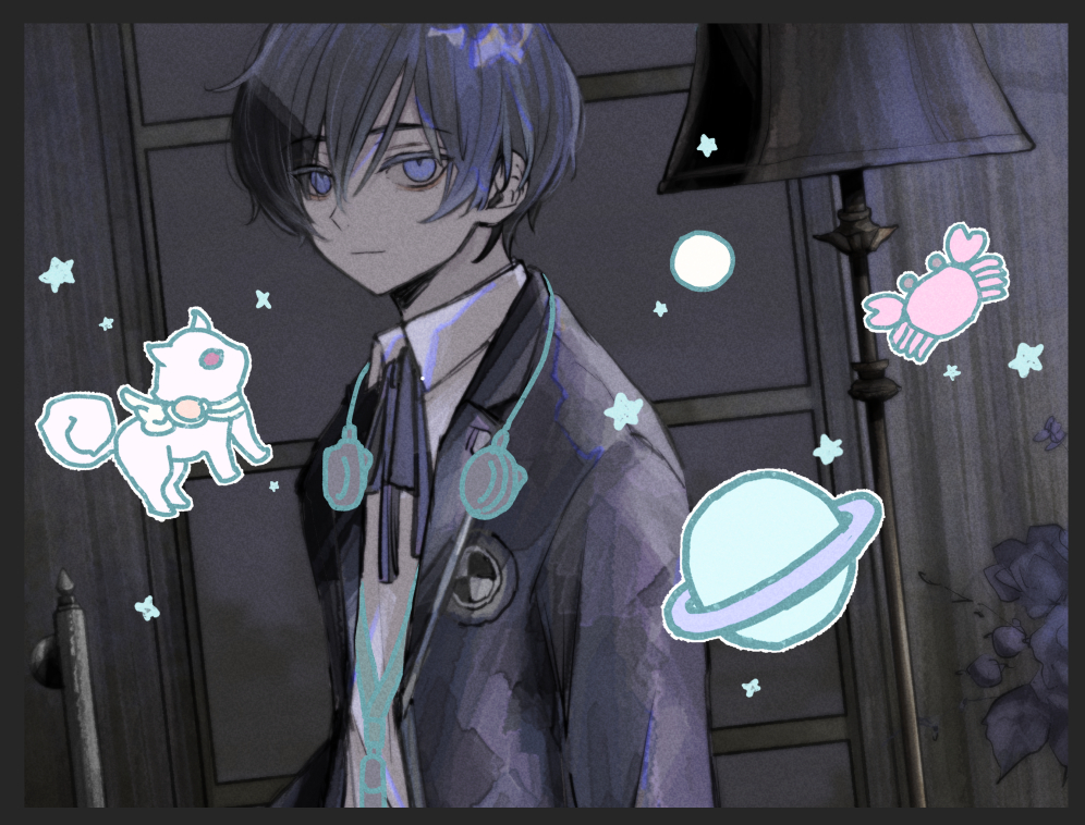 1boyarms at sidesblack borderblack jacketblue eyesblue hairblue ribbonborderchibiclosed mouthcrabdigital media playerdigital walkmandogdrawn objectdrawn stardutch angleearphonesfloor lampgekkoukan high school uniformhair between eyesindoorsjacketlamplampshadelong sleeveslooking at viewermale focusopen clothesopen jacketplanetribbonsaturn (planet)school uniformshirtshort hairupper bodywalkman nw-s203fwhite shirtwindow