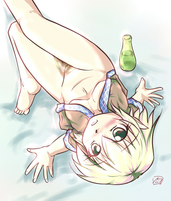 1girlbarefootblonde hairblushbottlebottomlessbreastsdrinkfeetfemale focusfrom abovelooking upopen clothesopen shirtpussyshirtshort hairsolouncensoredwakamezake