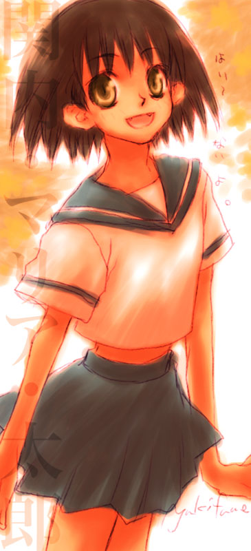 00sbrown eyesbrown hairdark skindark-skinned femalefangmidriffschool uniformshort hairsignatureskirtsmilesolo
