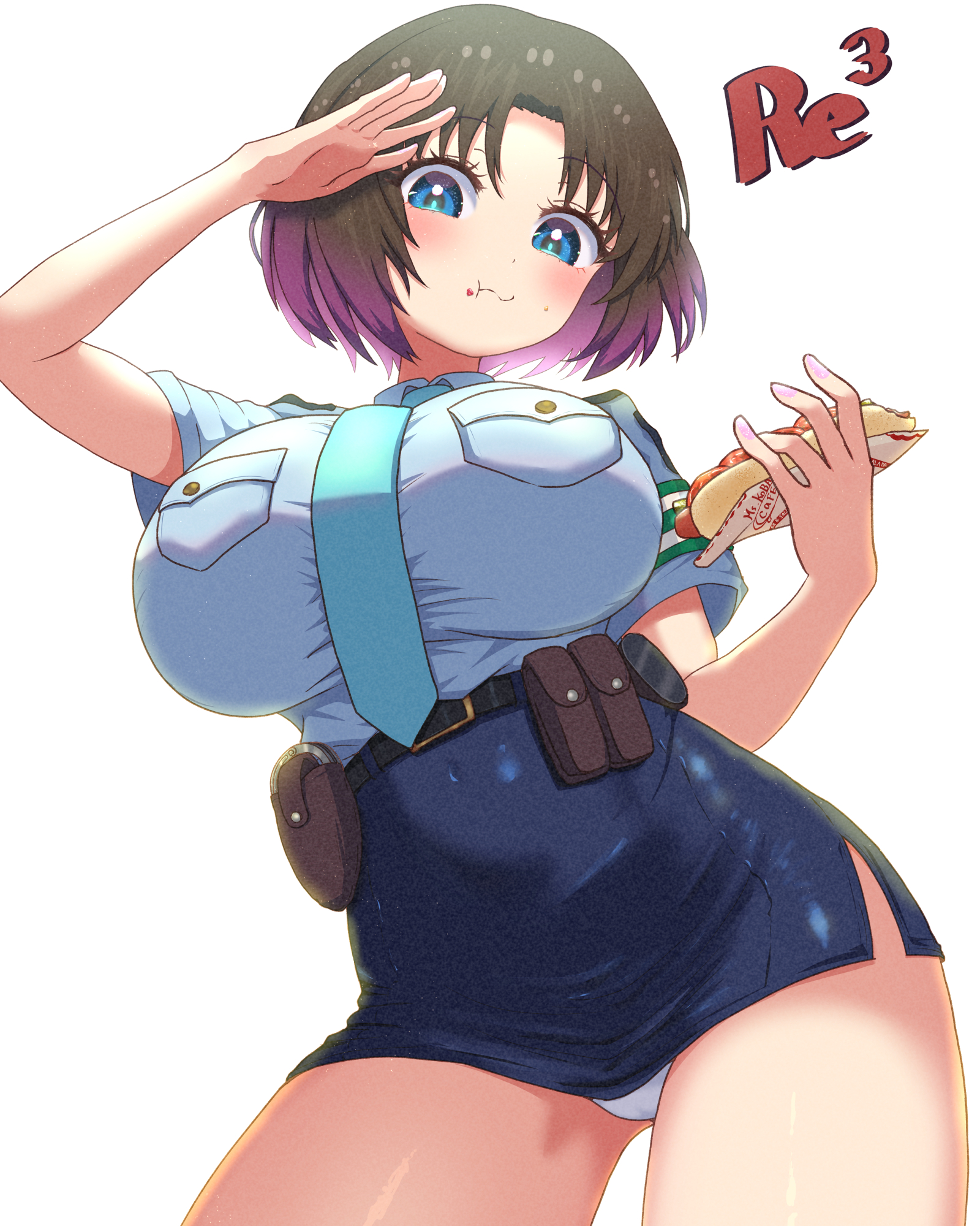 :t1girlbeltbelt pouchblack beltblack hairblue eyesblue necktieblue shirtblue skirtblushbreast pocketbreastscowboy shoteatingfoodfood on facefrom belowgradient hairhigh-waist skirtholdingholding foodhot doghuge breastslooking at viewerlooking downminiskirtmulticolored hairnecktiepantiespantyshotpencil skirtpocketpolicepolice uniformpolicewomanpouchpurple hairsaluteshirtshort hairshort sleevessimple backgroundskirtsolostandingtwo-tone hairunderwearwavy mouthwhite backgroundwhite panties