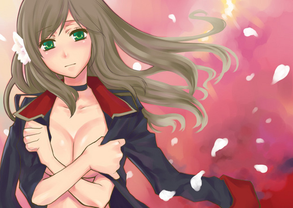 00s1girlbreastsbrown hairchokercleavagecoatfemale focusflowergradient backgroundgreen eyeshair flowerhair ornamentlarge breastslong hairnaked coatsolo