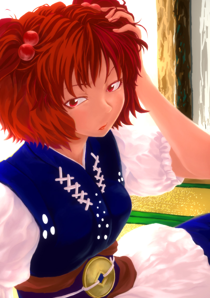 1girlarm upfemale focushair bobbleshair ornamentlipspuffy short sleevespuffy sleevesred eyesred hairruffling hairsashshort hairshort sleevessittingskirtsolotwintailstwo side up