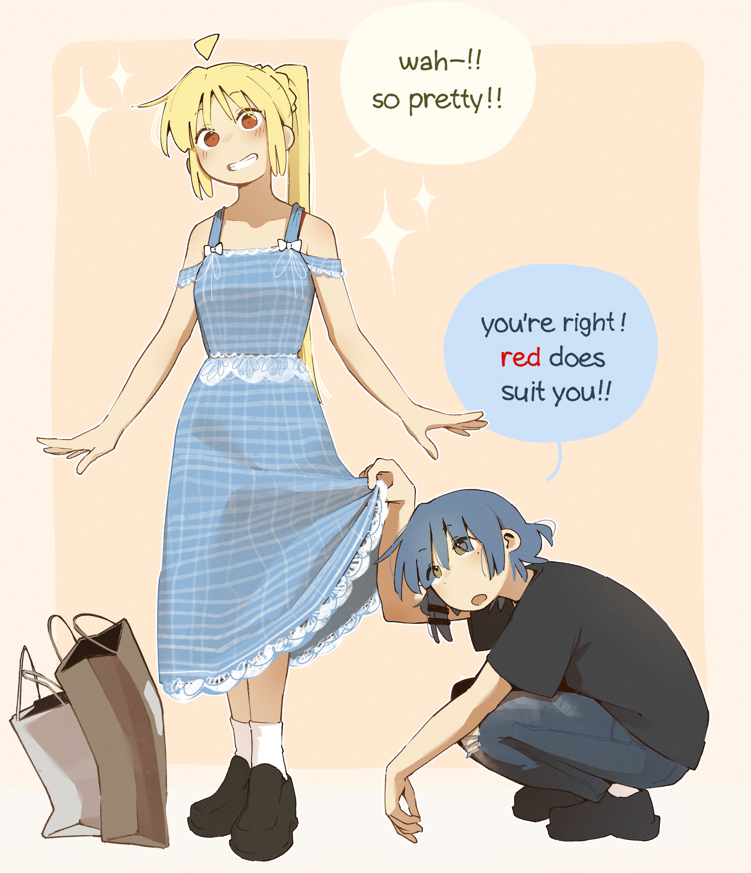 2girlsahogeblack pantsblack shirtblonde hairblue dressclothes liftdetached ahogedressenglish textgrinhair ornamenthaircliplong hairmedium hairmolemole under eyemultiple girlsopen mouthpantsred eyesshirtshopshort sleevesside ponytailsimple backgroundsleevelesssleeveless dresssmilesquattingteethyellow eyesyuri