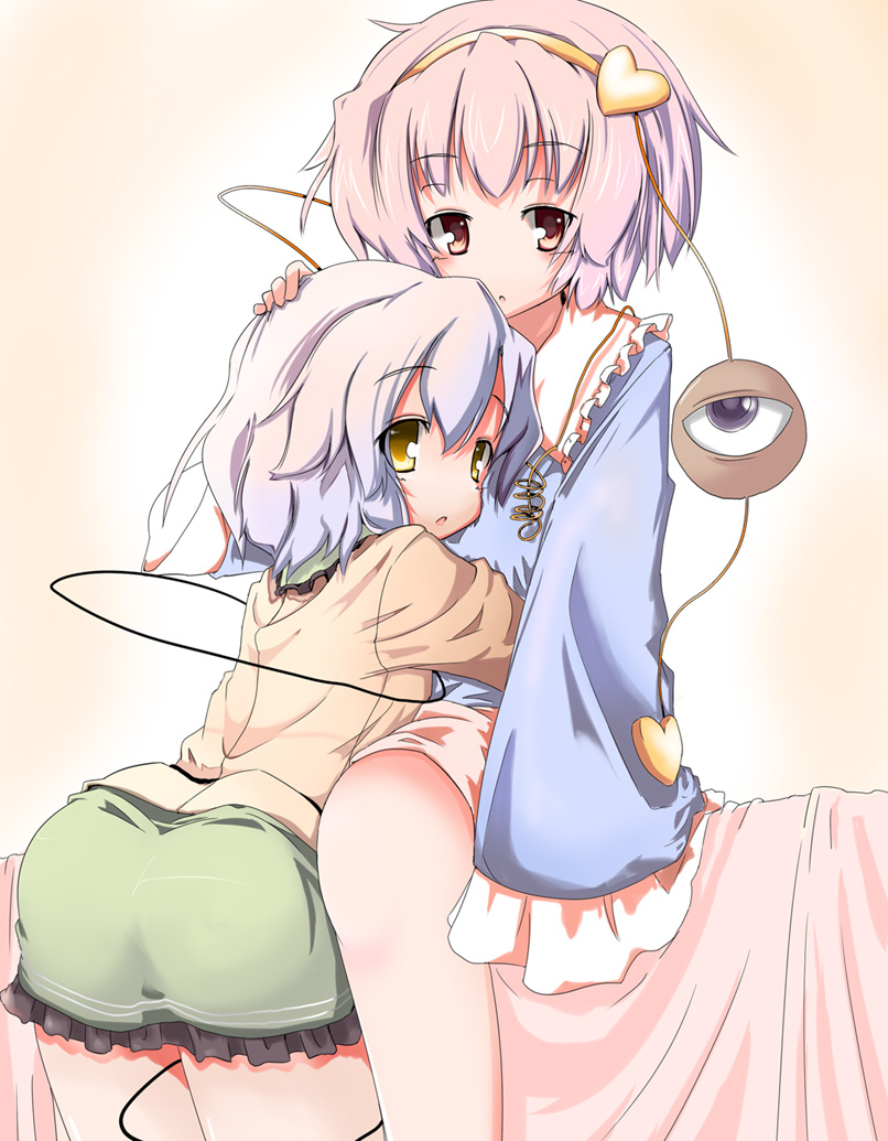2girlsfemale focusgradient backgroundhairbandheadpathearthugmultiple girlspurple hairshort hairsiblingssistersskirtwhite backgroundwhite hairyellow eyes