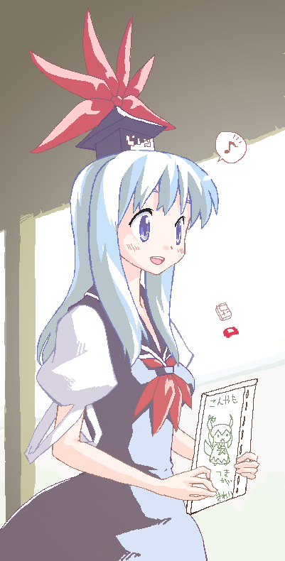 1girlblue eyesblue hairblue hatfemale focushatlong hairneckerchiefpixel artred neckerchiefsolospeech bubblestanding