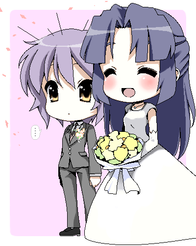 koizumi itsuki, nagato yuki, suzumiya haruhi no yuuutsu, highres, official art, >:d, 00s, 1boy, 1girl, :d, belt, brown eyes, brown hair, collared shirt, energy ball, expressionless, grey hair, h (letter), necktie, open mouth, outstretched hand, ribbon, school uniform, serafuku, shadow, shirt, short hair, short sleeves, skirt, smile, v-shaped eyebrows, white shirt