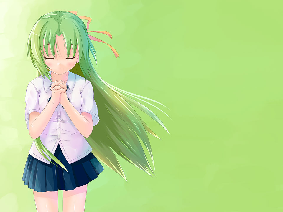 00sclosed eyescowboy shotgreen hairhair ribbonlong hairown hands claspedown hands togetherribbonschool uniformskirtsolo