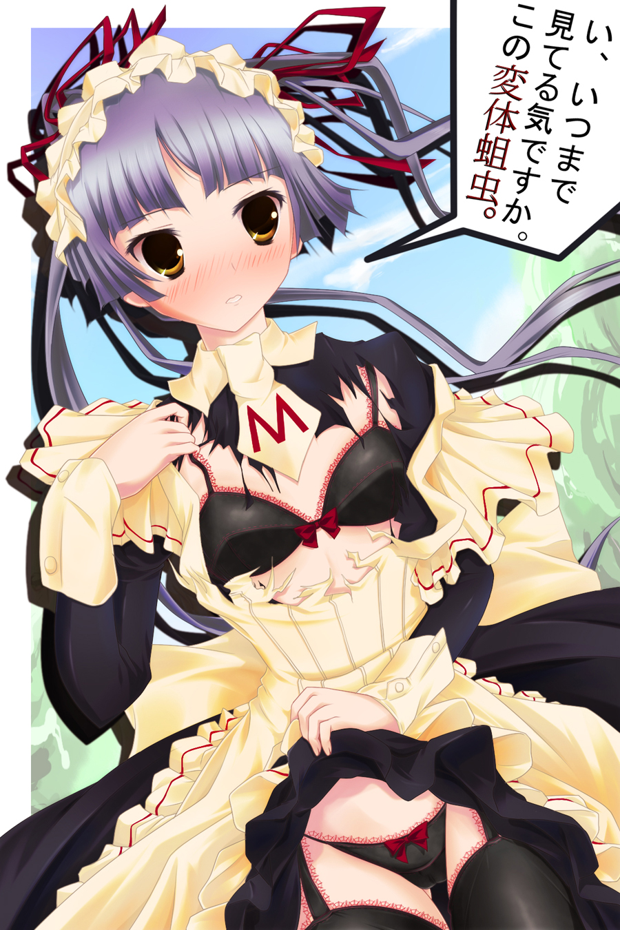 00s1girlblushbowbradressfemale focusgarter strapshair ribbonhairbandlingeriemaidpantiespurple hairribbonsolothighhighstorn clothestwintailsunderwearyellow eyes