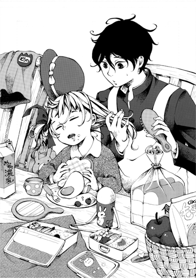 jomy marquis shin, physis, rain (nakinezumi), soldier blue, toward the terra, uniform, lowres, translated, 1girl, 2boys, ^ ^, blonde hair, boots, bracelet, cape, closed eyes, crossed legs, cup, dress, gloves, jewelry, lips, monster, multiple boys, on shoulder, parted lips, purple dress, sitting, smile, standing, tea, teacup