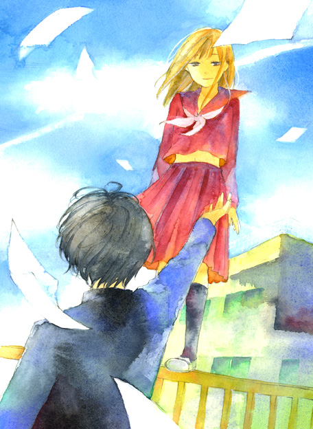 tatsumi kyouhei, takarada rikka, gridman universe, ssss.gridman, highres, 1girl, black hair, black skirt, blue eyes, blush, bow, bowtie, breasts, cardigan, kurumada masami (style), long hair, long sleeves, looking at viewer, outdoors, parody, pleated skirt, red bow, school uniform, scrunchie, shirt, sitting, skirt, solo, style parody, thighs, white cardigan, white shirt, wrist scrunchie