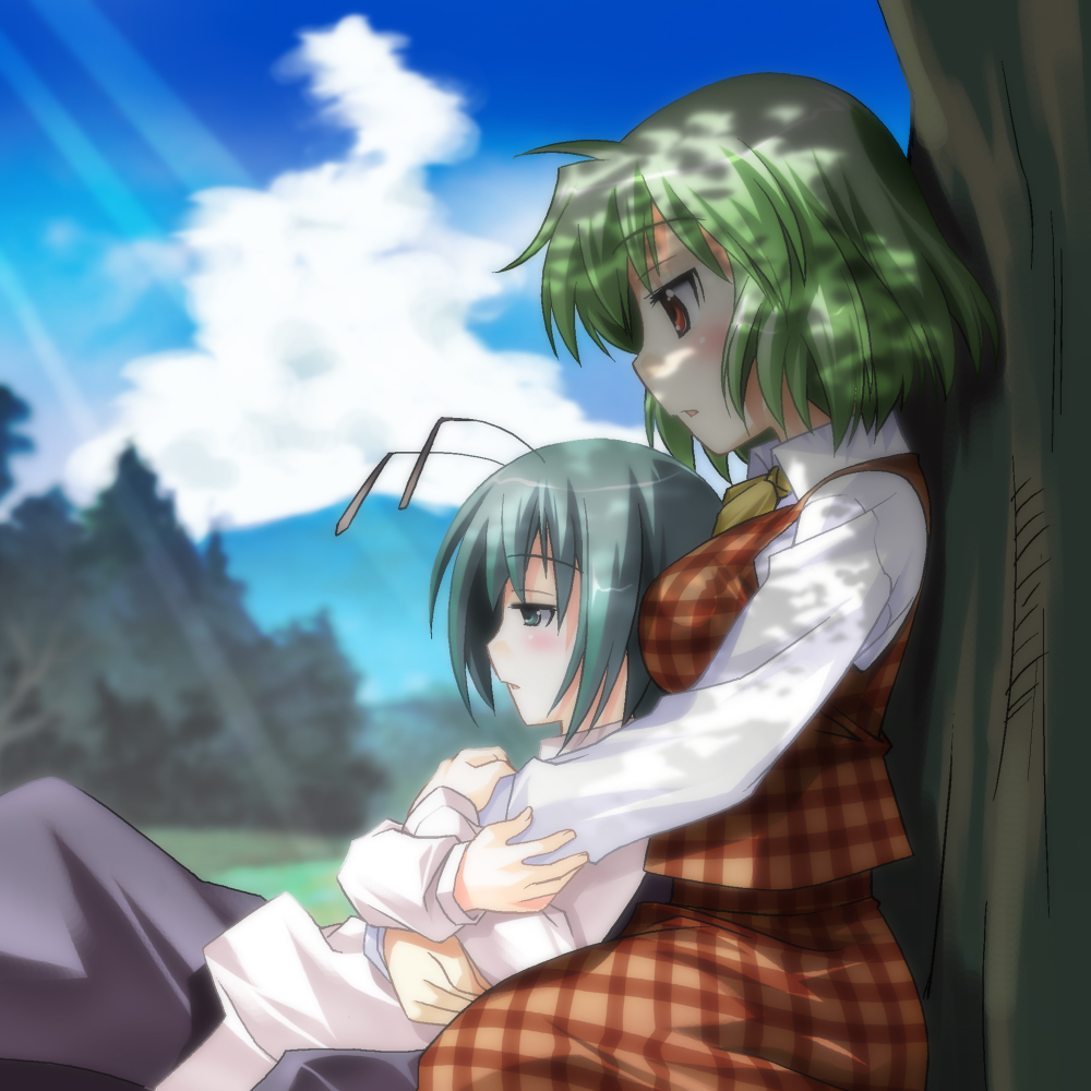 2girlsagainst treeandrogynousantennaeascotblushdappled sunlightfemale focusgreen eyesgreen hairhughug from behindlight raysmultiple girlsnatureplaid clothesplaid skirtplaid vestprofilered eyesreverse trapshadeshort hairskirtskirt setsunbeamsunlighttreevestyuri