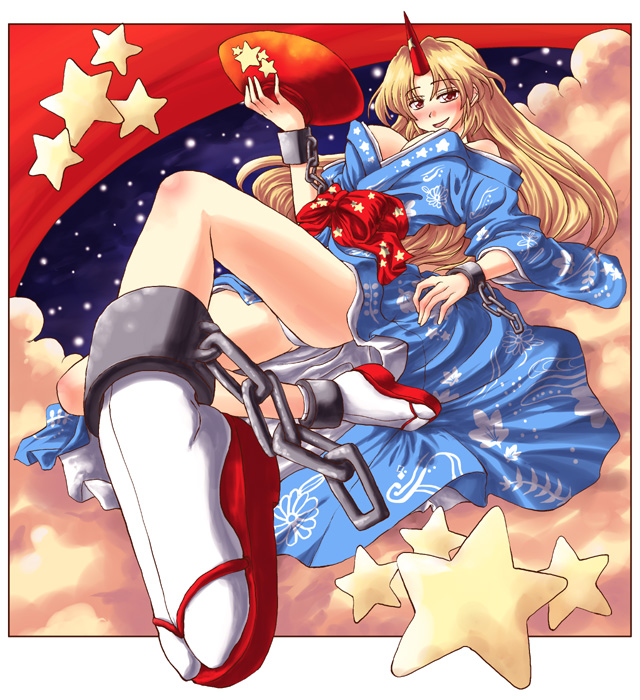 1girlankle cuffsbare shouldersblonde hairblushbreastschaincleavagecloudcuffscupfeetfemale focusforeshorteningfrom belowhornsjapanese clotheskimonolong hairmedium breastspantiespantyshotred eyesribbonsakazukisandalssingle hornsolostar (symbol)star printtabiunderwearzouri