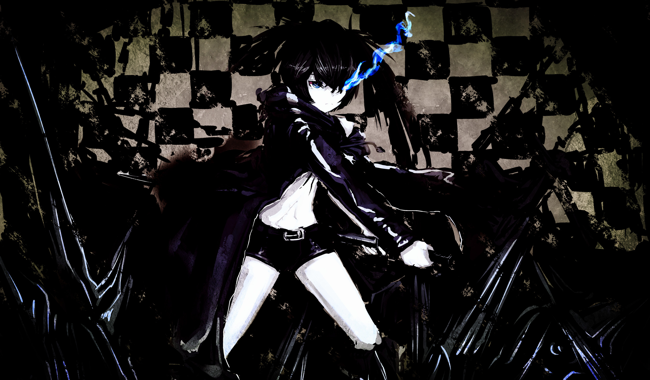 beltblack coatblack hairblack shortsblue eyesblue firechaincoatfireflaming eyeglowingglowing eyehoodhooded coatlong hairno shirtopen clothesopen coatpale skinshortsswordtwintailsuneven twintailsweapon
