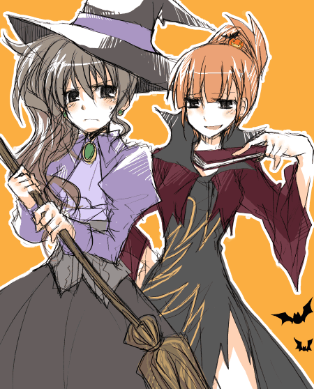 00s2girlsbat (animal)blushbroomcostumefood-themed hair ornamenthair ornamenthalloweenhand fanhatjack-o'-lanternmultiple girlsorange backgroundpumpkinpumpkin hair ornamentshort hairvampirewitch hat
