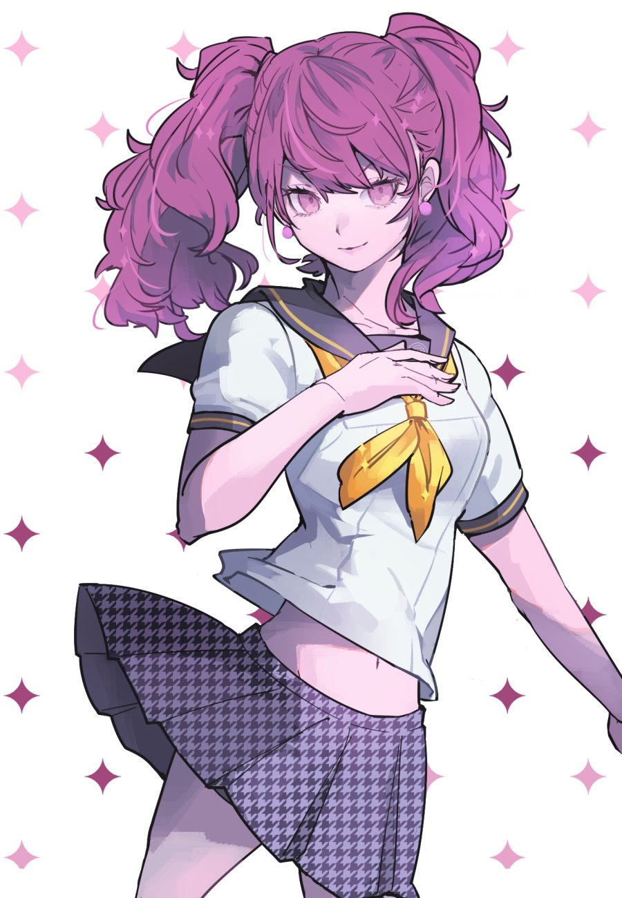 1girlawakeri99black sailor collarbreastsbrown hairclosed mouthcowboy shotearringshand on own hipjewelrylong hairmedium breastsnavelneckerchiefpink eyespleated skirtprint skirtsailor collarschool uniformshirtshort hairskirtsmilesolotwintailswhite shirtyellow neckerchief
