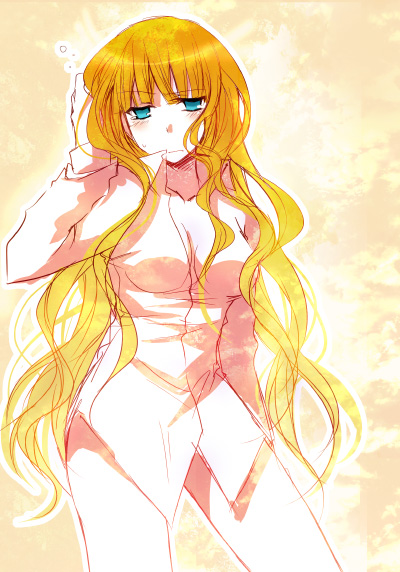 00s1girlalternate hairstyleblonde hairblue eyesblushbottomlessbreastscleavagecollared shirtfemale focushair downlong hairmedium breastsno pantsopen clothespajamasshirtsleepysolovery long hairwavy hair