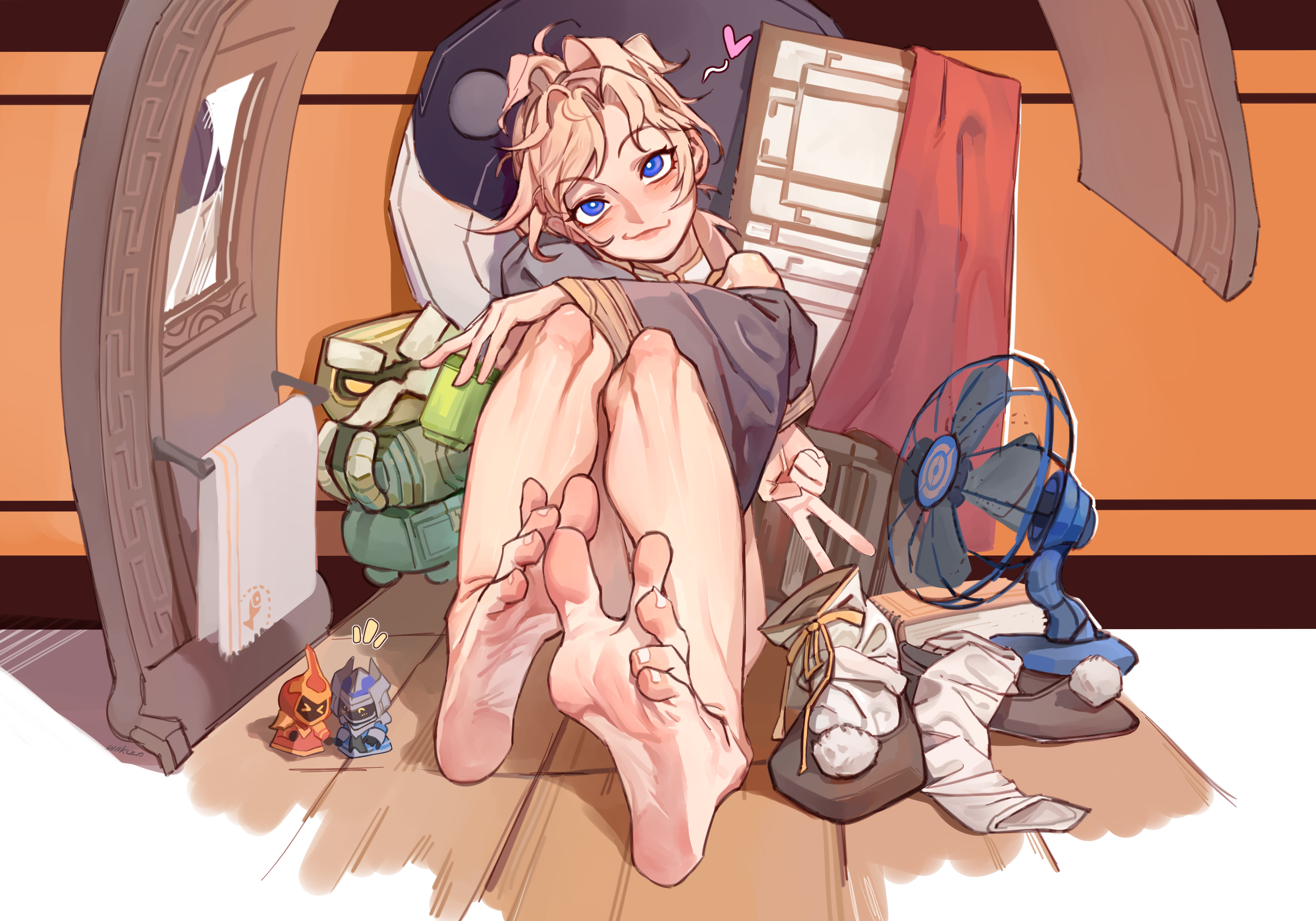 1girlbarefootblonde hairblue eyesblushelectric fanfeetlong hairlooking at viewershoessmilesockssolestoesunworn shoesunworn socks
