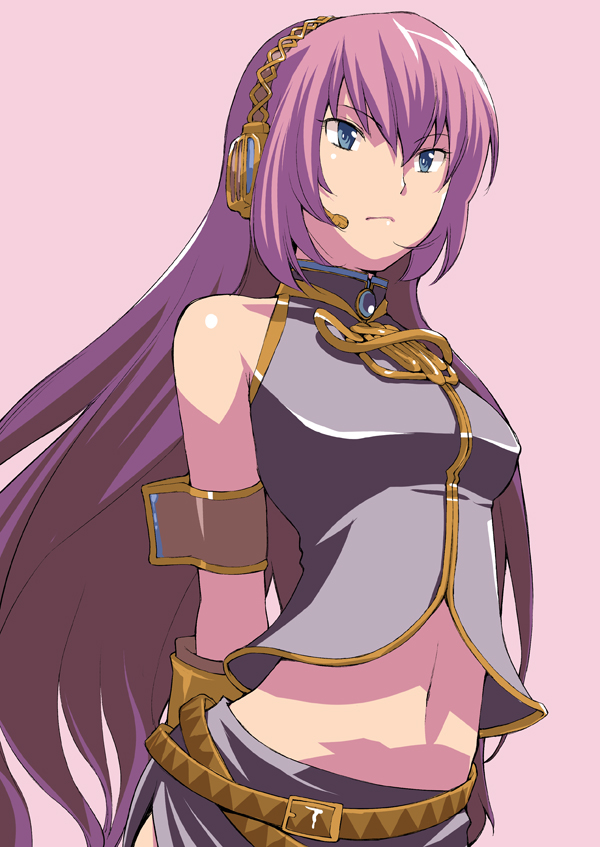 1girlbare shouldersbeltblue eyesfemale focusheadsetlong hairmidriffnavelpink hairsimple backgroundsolostanding