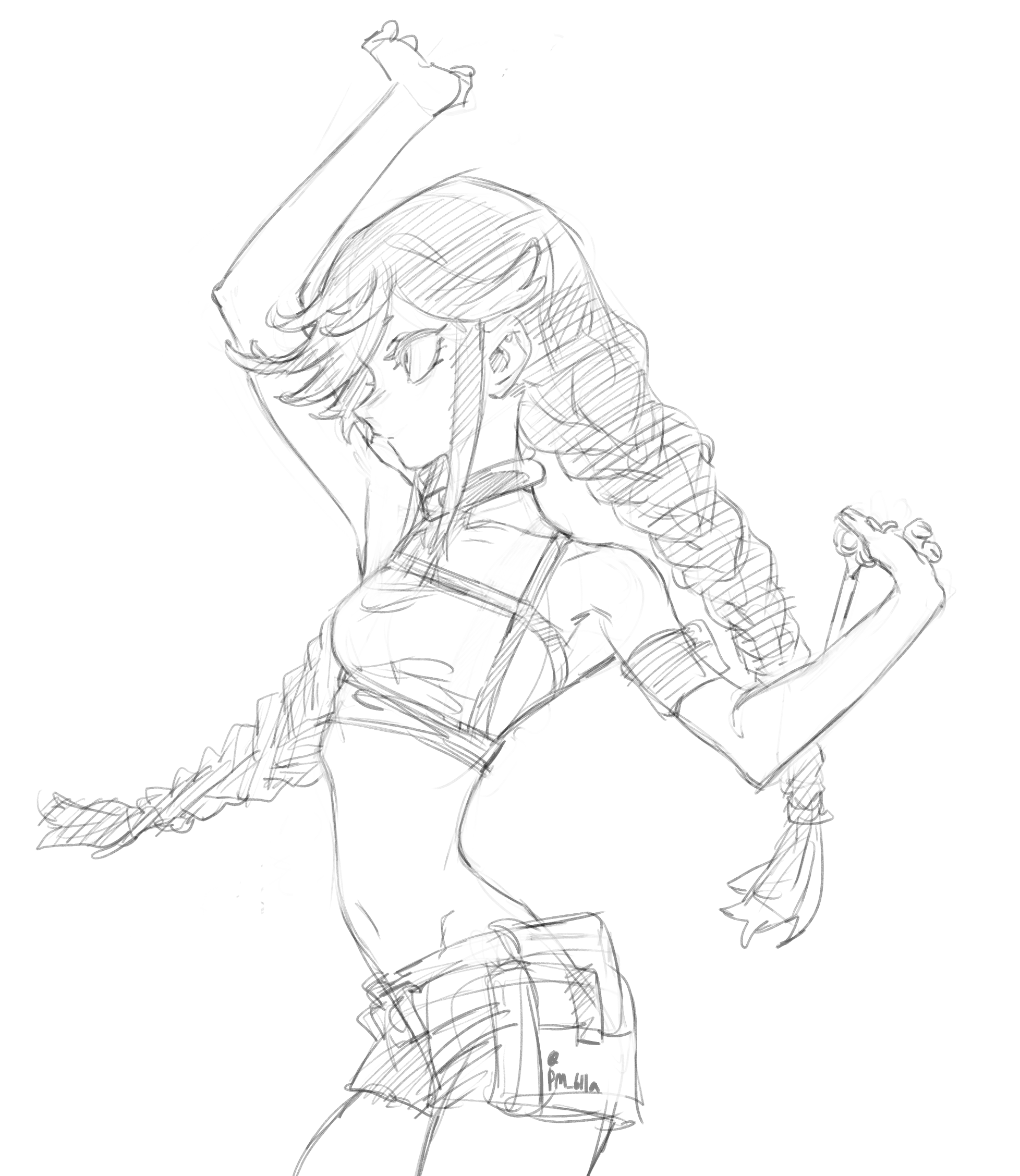 1girlarms upbare shouldersbraidchokercollarbonecowboy shotcrop topflipped bangsgreyscalehip boneslow twin braidsmonochromenavelshortssimple backgroundsketchskinnysolotwin braids